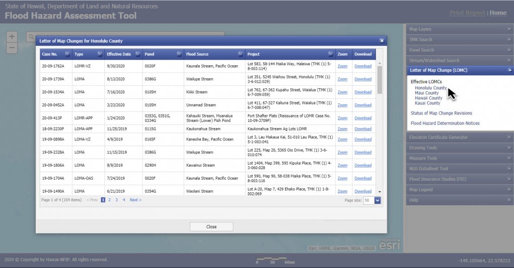 The Department of Land and Natural Resources has developed and maintains the Hawaii Flood Hazard Assessment Tool (FHAT). The FHAT is an informational map viewer that displays FEMA’s Geographic Information Systems (GIS) version of the FIRM map. User can search by area of interest, address, TMK number, stream or watershed name, and by a specific Letter of Map Change (LOMC).